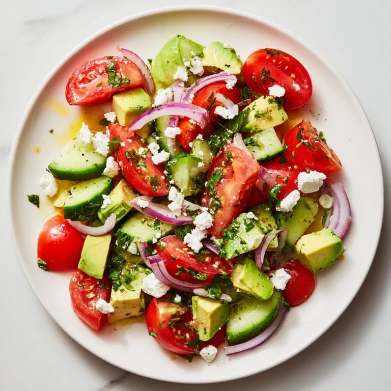 Save A vibrant, refreshing salad bursting with juicy tomatoes, crisp cucumber, creamy avocado, and tangy feta, dressed in a light lemon-olive oil vinaigrette. Perfect as a side or light main.