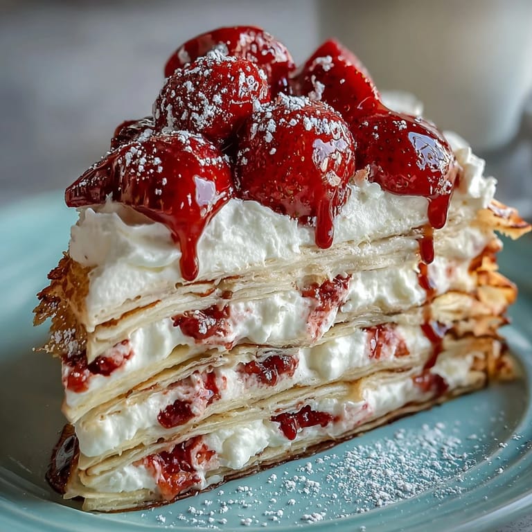 Save The scent of strawberries always lingers a bit longer in my kitchen when I make this crêpe cake. Last spring, the temptation to create something layered and light gave way to stacks of paper-thin crêpes, each one tempting me to sneak a taste. I remember hearing the soft hiss of batter hitting the hot pan, an oddly calming soundtrack to my Mother’s Day morning. There is an unspoken satisfaction in seeing the final cake—rosy, towering, and celebratory—come together. This is the dessert I crave when I want to give a little extra joy to a table full of laughter.