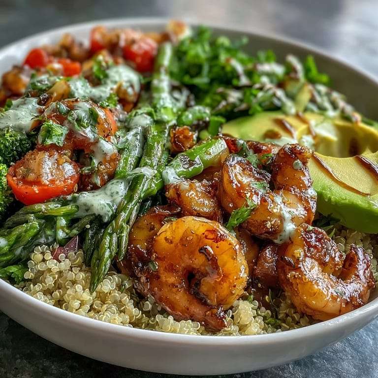Save My neighbor brought over this rainbow bowl one afternoon, and I remember being struck by how something so effortlessly colorful could taste so clean and alive on the tongue. She'd spent fifteen minutes in her kitchen tops, and the result was sitting there in two elegant bowls like edible art. I asked for the recipe on the spot, and what I love most is how it's taught me that healthy eating doesn't need to feel like punishment or compromise. The shrimp turns golden, the vegetables stay bright, and that balsamic dressing pulls everything together into something genuinely craveable.