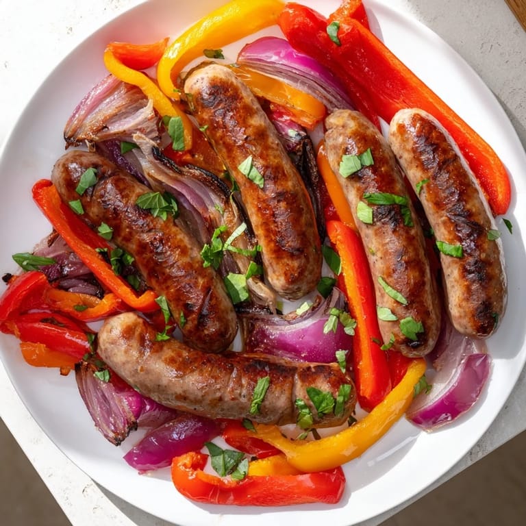 Save A vibrant, no-fuss dinner featuring juicy Italian sausages roasted to perfection with sweet bell peppers and onions—all made on a single sheet pan for easy cleanup.